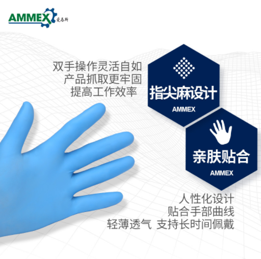爱马斯一次性蓝色丁腈手套,不含乳胶成分,不易导致过敏;采用超薄技术精制而成,贴肤舒适,减少手部疲劳;同时拥有良好的拉伸强度、耐穿刺性能。